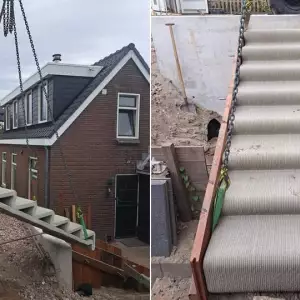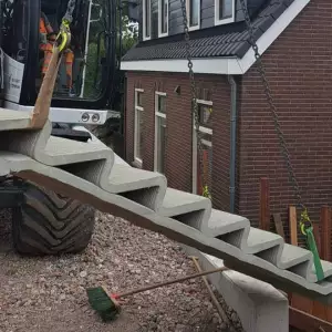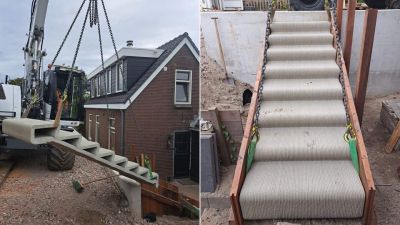 The stairway was delivered as a complete, ready‑to‑install product, allowing it to be hoisted and mounted immediately. This minimized on‑site time and enabled an exceptionally efficient installation. As with all our 3D‑printed stairways, this embankment stair contains no reinforcement and requires approximately 50% less concrete compared to traditionally manufactured stairways. This significantly reduces both material use and CO₂ emissions — making it a genuinely sustainable choice.